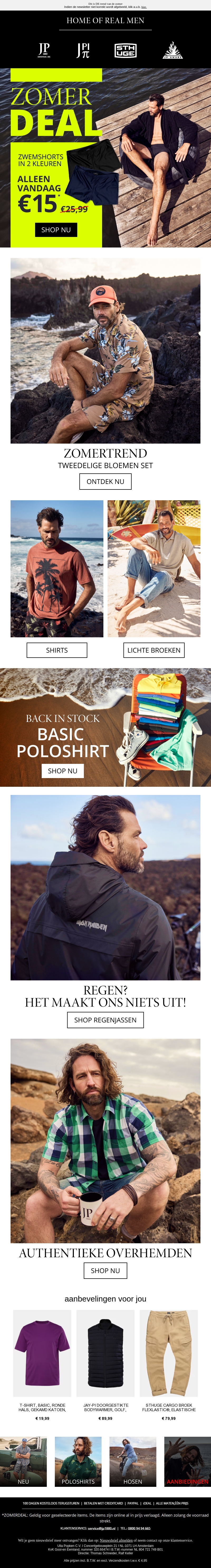 Ontvang zwembroeken in twee kleuren voor slechts €15! Duik in de zomertrend met tweedelige bloemen sets, T-shirts, lichte broeken, en meer. Shop onze authentieke overhemden en zorg dat je voorbereid bent op regenachtige dagen met onze regenjassen.