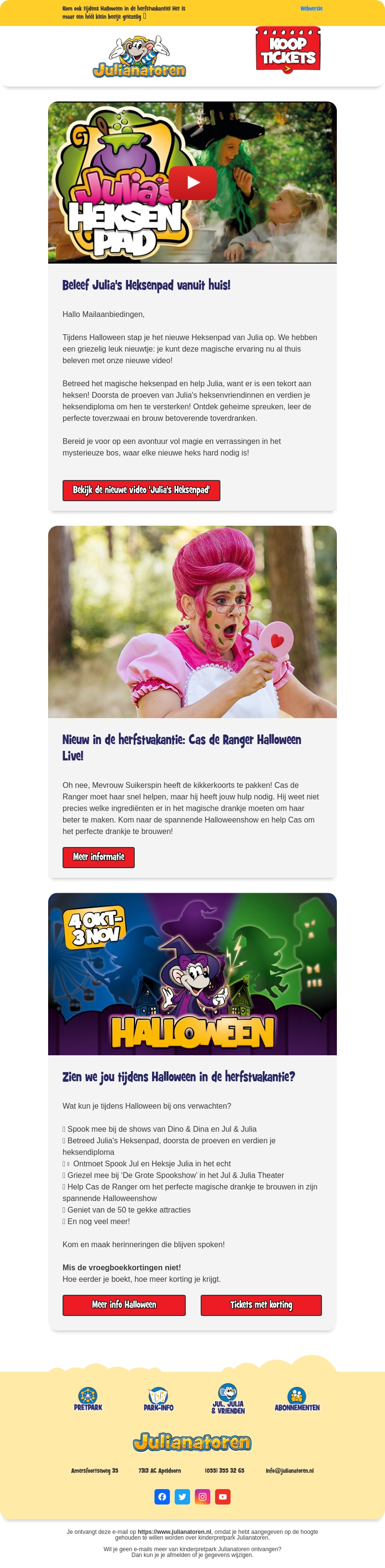 Stap in de wereld van magie met Julia's Heksenpad! Ontdek geheime spreuken, beleef verrassingen en verdien je heksendiploma. Bereid je voor op een avontuur vol betovering en ontdek meer over de spannende Halloweenactiviteiten in Julianatoren.