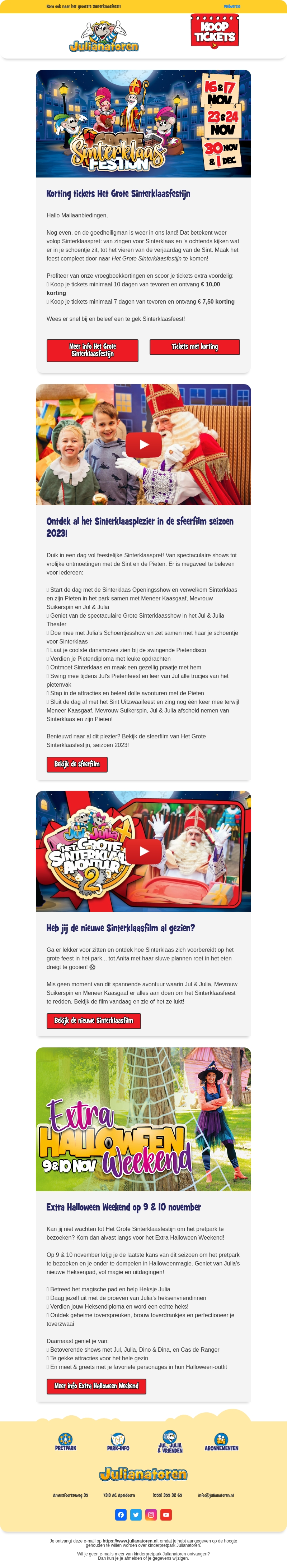 Welkom bij Het Grote Sinterklaasfestijn bij Julianatoren! Geniet van spectaculaire shows, ontmoet Sinterklaas en de Pieten, en beleef de magie van het seizoen. Scoor nu tickets met korting en maak je klaar voor een onvergetelijke ervaring vol plezier. Ontdek de nieuwste Sinterklaasfilm en kom langs tijdens speciale evenementen. Mis dit feestelijke spektakel niet!