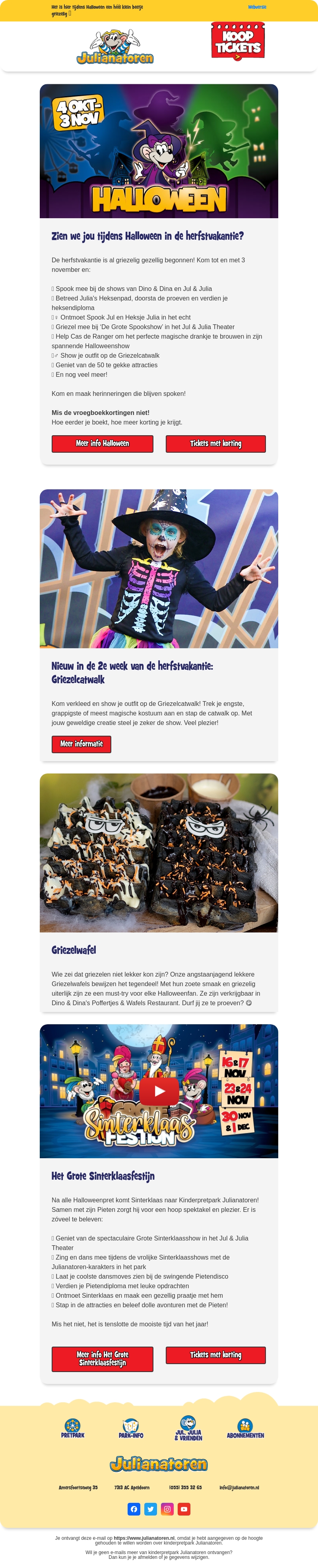 Ontdek de magie van Halloween in Kinderpretpark Julianatoren! Van 4 oktober tot 3 november kun je genieten van spannende shows met Dino & Dina en Jul & Julia. Proef de griezelige lekkernijen en probeer de befaamde 'Griezelwafel'. Bereid je voor op het Grote Sinterklaasfeest met veel spektakel en zang.
