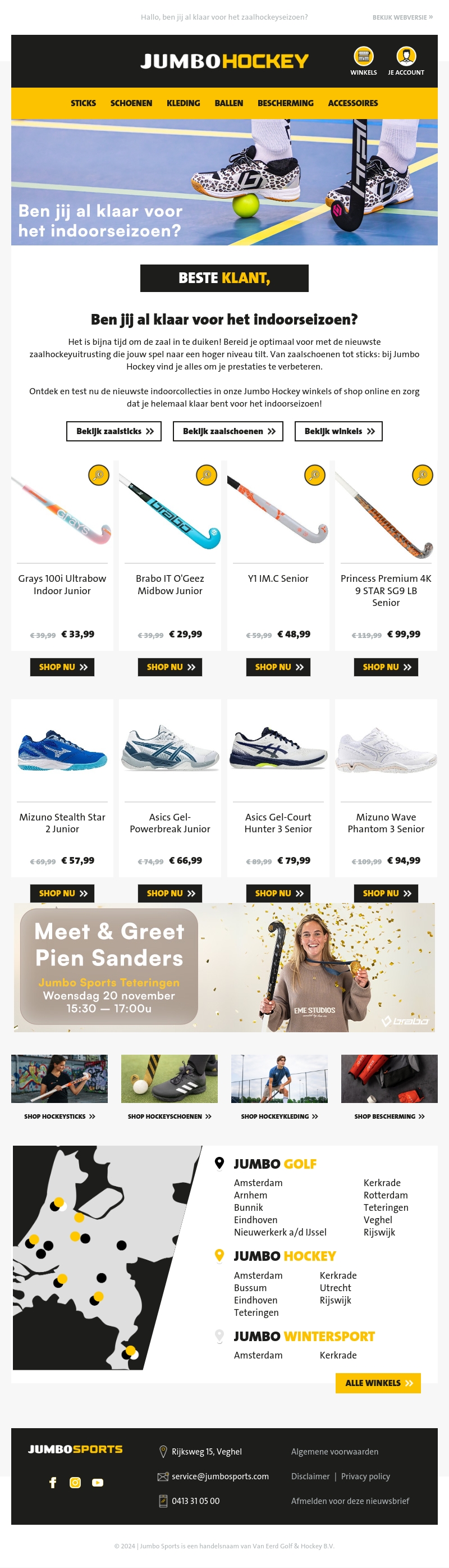 Het indoorseizoen staat voor de deur en bij Jumbo Hockey vind je alles wat je nodig hebt om je spel naar een hoger niveau te tillen. Ontdek onze nieuwste zaalstokken, schoenen en accessoires. Daarnaast kun je een exclusieve meet & greet met Pien Sanders bijwonen. Bezoek onze winkels of shop online om optimaal voorbereid te zijn.
