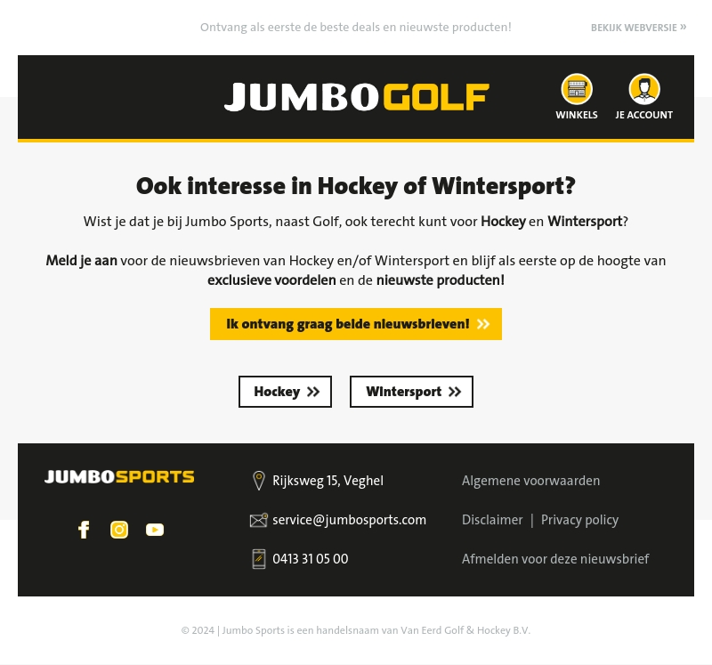 Bij Jumbo Sports kun je naast Golf ook terecht voor Hockey en Wintersport. Meld je aan voor onze nieuwsbrieven en ontvang exclusieve voordelen en de nieuwste producten. Mis geen updates en blijf altijd voorop in de sportwereld.