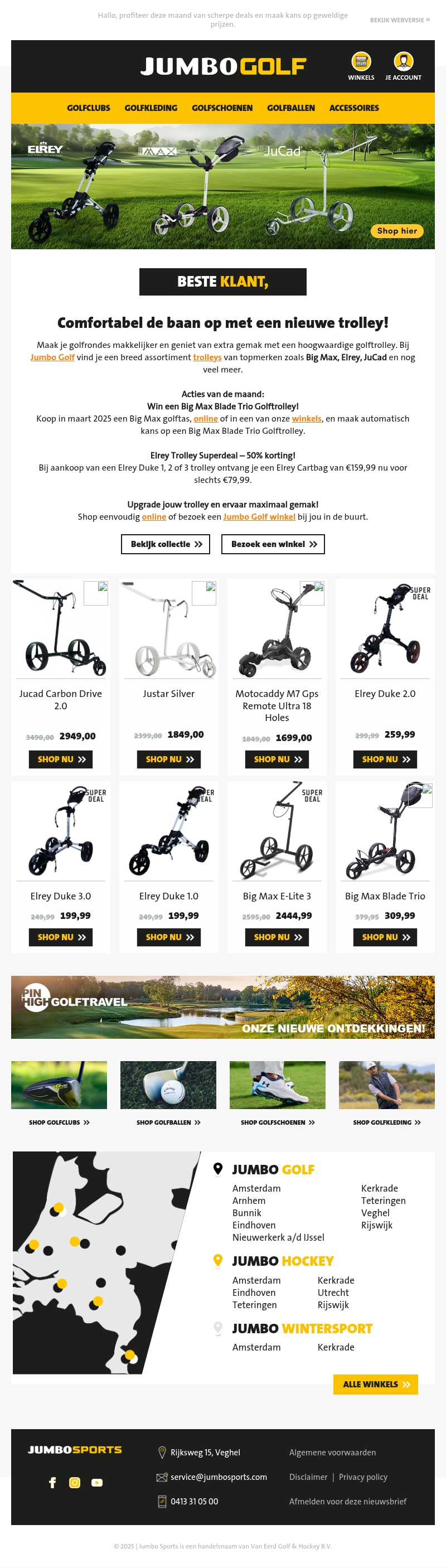 Ontdek de nieuwste collectie golftrolleys bij Jumbo Golf. Met merken als Big Max, Elrey en JuCad is er voor ieder wat wils. Profiteer van acties zoals de Elrey Trolley Superdeal met 50% korting en maak kans op een Big Max Blade Trio Golftrolley. Bezoek onze winkels of shop eenvoudig online en ervaar het gemak van een nieuwe trolley.