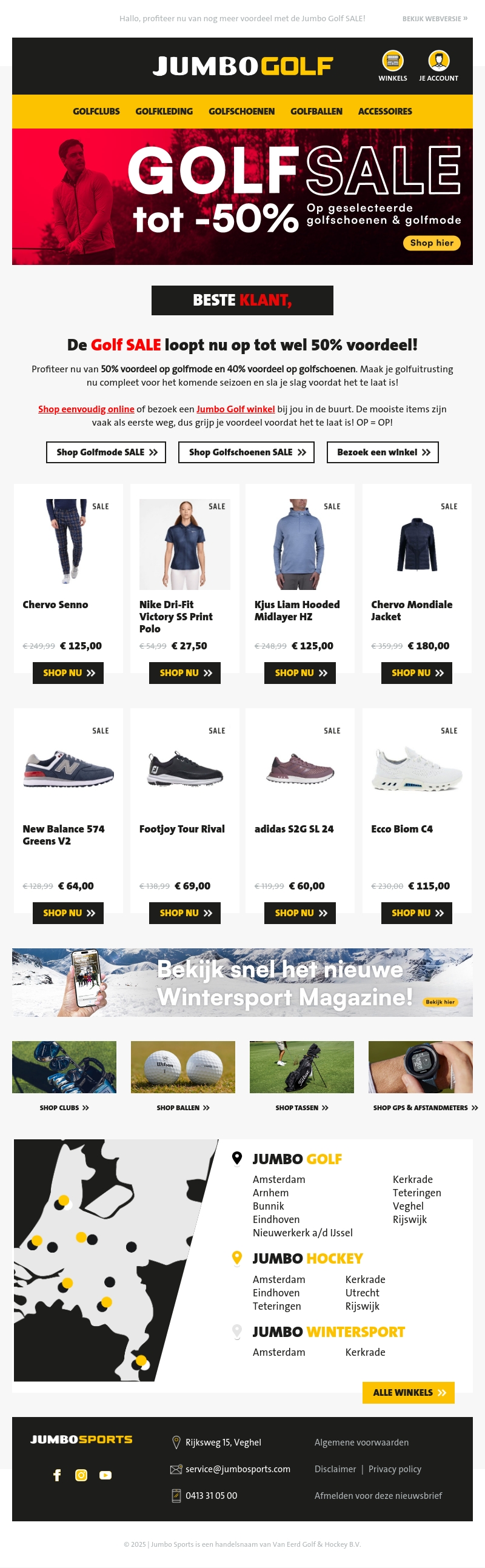 Bezoek de Jumbo Golf SALE voor kortingen tot 50% op geselecteerde golfmode en golfschoenen. Mis de kans niet om je uitrusting compleet te maken voor het komende seizoen. Shop eenvoudig online of in een van onze winkels in de buurt. Voorraad is beperkt, dus wacht niet te lang!
