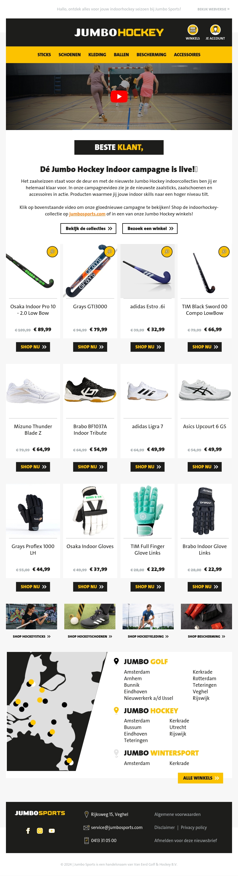 De indoor hockeycampagne van Jumbo Hockey is begonnen! Bereid je voor op het zaalseizoen met de nieuwste sticks, schoenen en accessoires. Bekijk de collectie online of bezoek een van onze winkels. Mis deze kans niet om je hockeyskills te verbeteren met topkwaliteit producten. Shop nu en profiteer van geweldige acties.