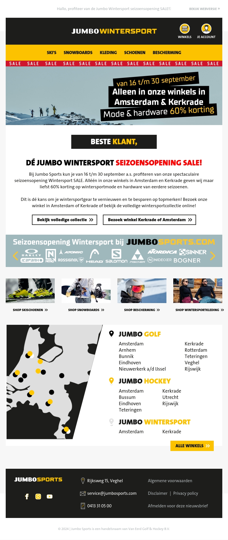Mis de Jumbo Wintersport seizoensopening SALE niet! Van 16 tot en met 30 september ontvang je maar liefst 60% korting op wintersportmode en hardware in onze winkels in Amsterdam en Kerkrade. Dit is jouw kans om je uitrusting bij te werken en te besparen op toonaangevende merken. Bezoek snel onze winkels of bekijk de volledige collectie online.