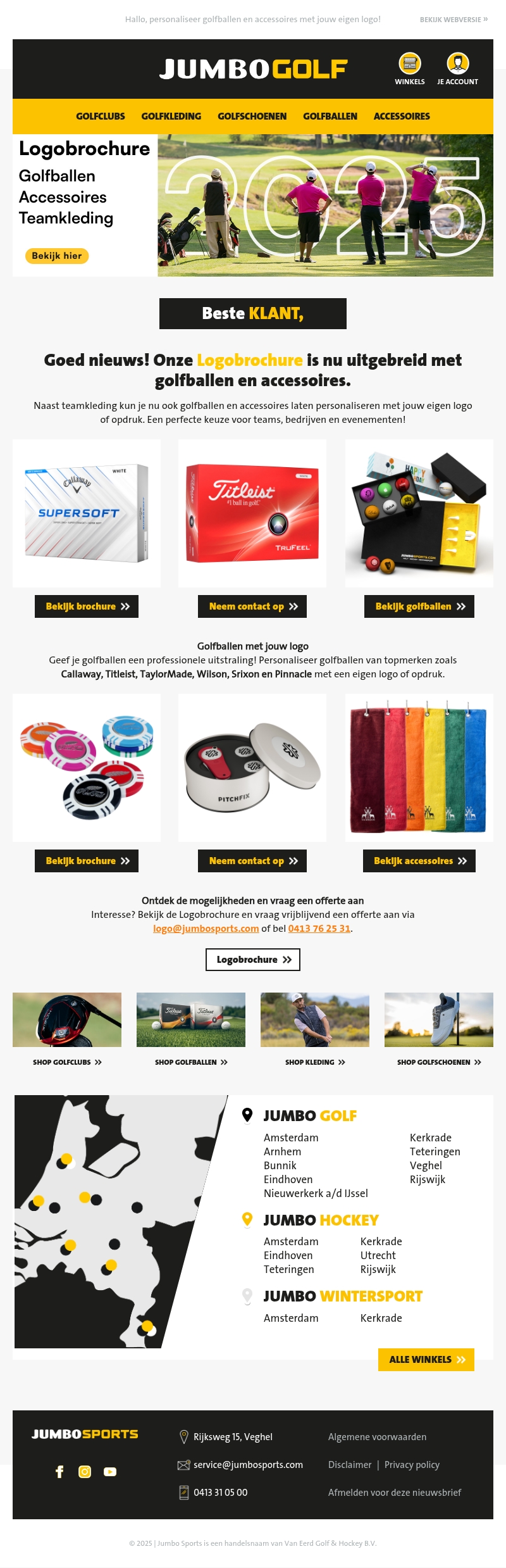 Goed nieuws voor golfliefhebbers! Onze Logobrochure is uitgebreid met golfballen en accessoires die je kunt personaliseren met je eigen logo. Een ideale keuze voor teams, bedrijven en evenementen. Bekijk nu onze brochures van topmerken zoals Callaway en Titleist. Ontdek alle mogelijkheden en vraag vandaag nog een offerte aan.