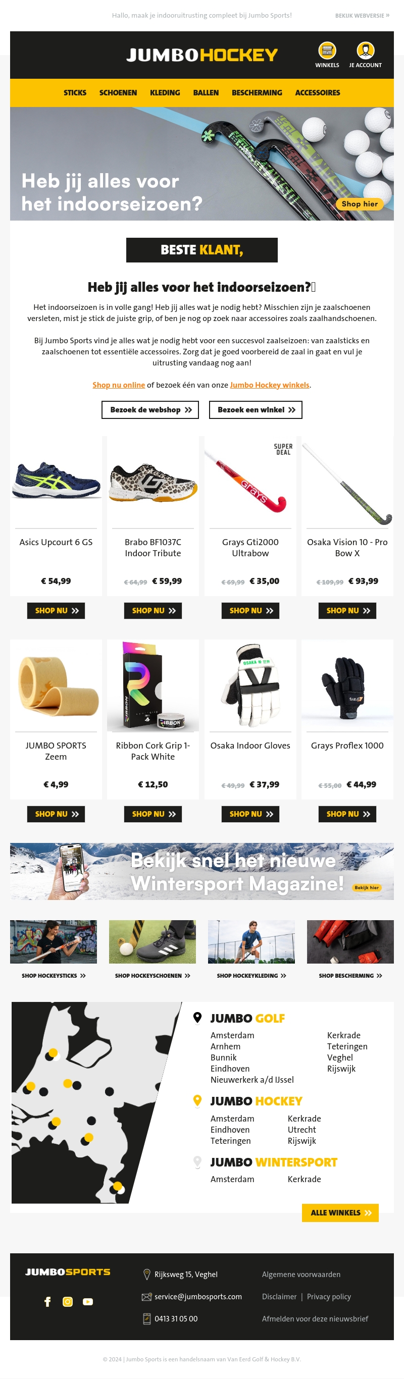 Het indoorseizoen is begonnen en bij Jumbo Hockey vind je alles wat je nodig hebt. Van sticks en sticks tot essentiële accessoires, zorg dat je goed voorbereid bent. Bezoek onze webwinkel of kom langs in één van onze winkels voor de nieuwste producten en aanbiedingen. Mis onze super deals niet en start je seizoen sterk!