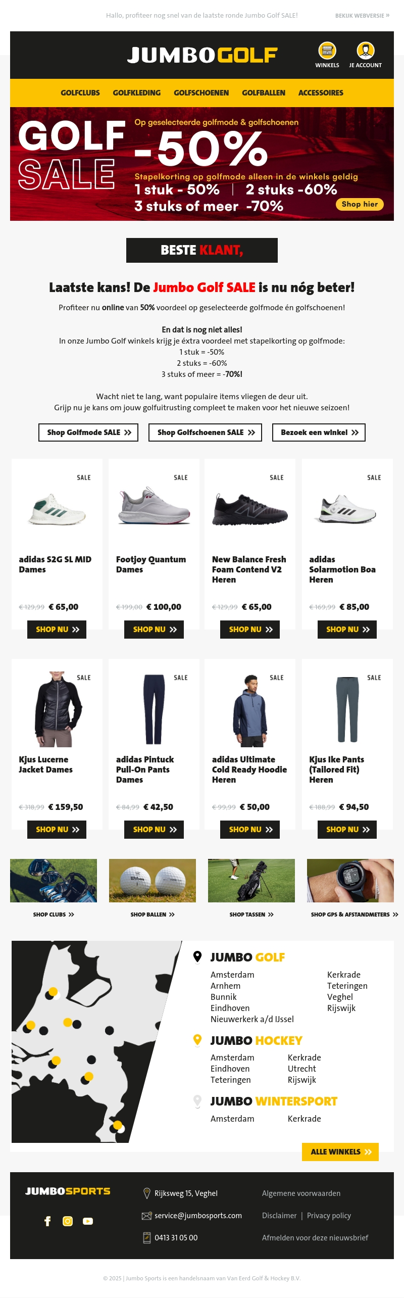 Het is de laatste kans om te profiteren van de Jumbo Golf SALE met kortingen tot wel 70%. Er zijn stapelkortingen op geselecteerde golfmode en golfschoenen. Grijp je kans om je golfuitrusting compleet te maken. Populaire items vliegen de deur uit, dus wacht niet te lang.
