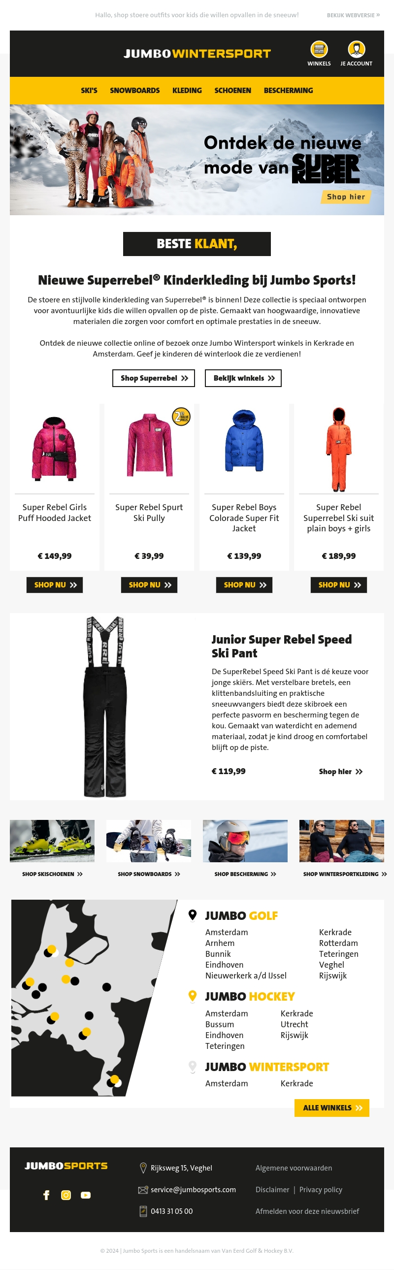 De nieuwste Superrebel® kinderkleding is gearriveerd bij Jumbo Sports! Perfect voor avontuurlijke kinderen die opvallen in de sneeuw. Ontdek de innovatieve materialen voor comfort en prestaties. Bekijk onze collectie online of in onze winkels in Kerkrade en Amsterdam. Zorg dat je kinderen de winter in stijl beleven!