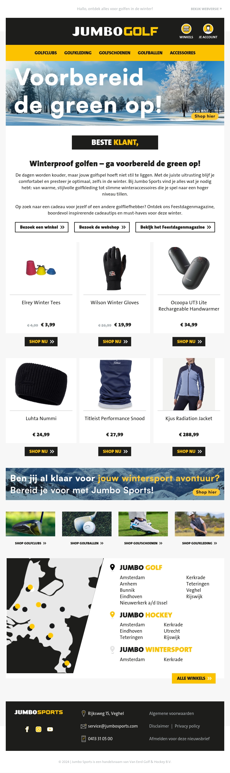 Bereid je voor op een geweldige winter vol golfplezier met de juiste uitrusting van Jumbo Golf. Ontdek stijlvolle winterkleding en accessoires die je spel naar een hoger niveau tillen, zelfs als de temperaturen dalen. Zoek het perfecte cadeau voor jezelf of een golfliefhebber. Bezoek onze webshop voor inspirerende cadeautips.