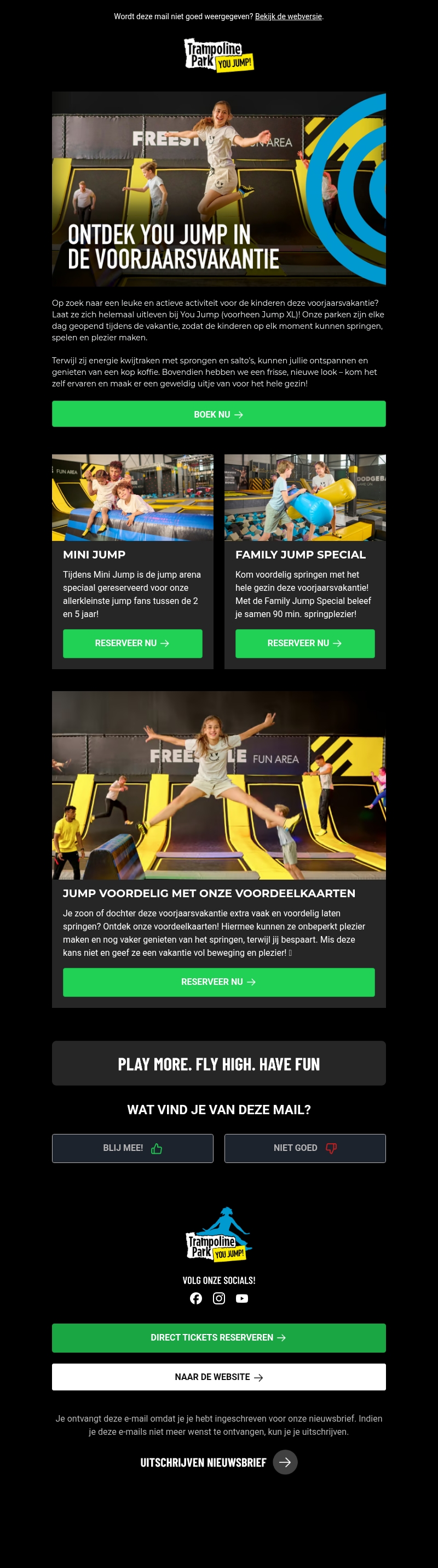 Ontdek het springplezier bij You Jump deze voorjaarsvakantie. Laat de kinderen zich uitleven in de jump arena's die geschikt zijn voor alle leeftijden. Geniet van speciale aanbiedingen zoals de Mini Jump voor de jongste fans en de Family Jump Special voor het hele gezin. Boek nu en beleef een vakantie vol beweging en plezier!