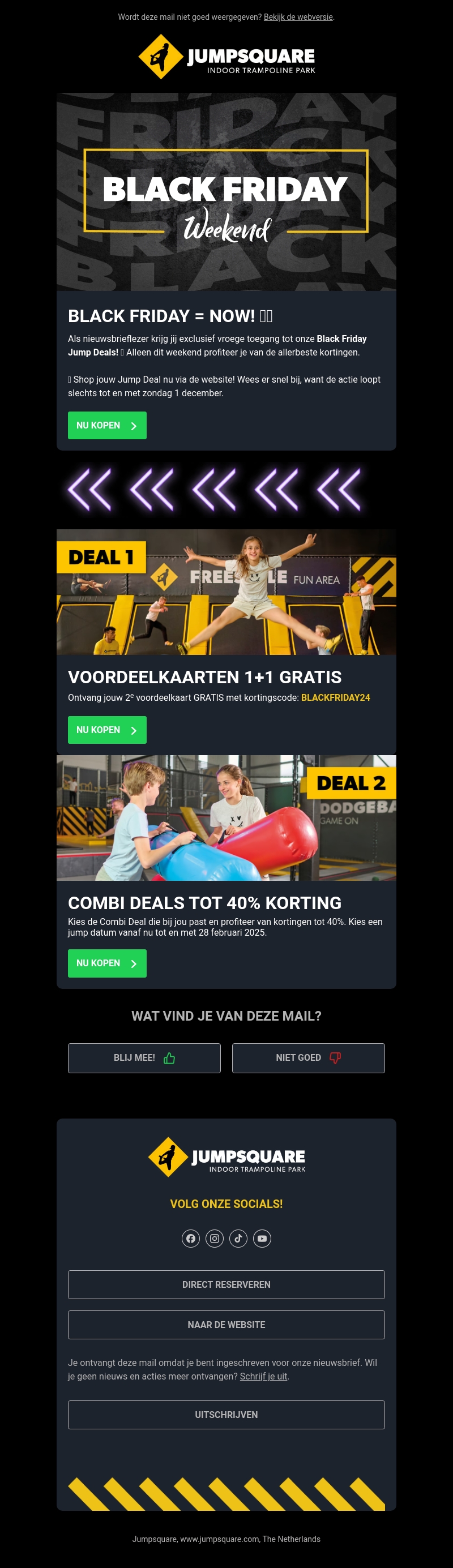 Profiteer van onze exclusieve Black Friday aanbiedingen bij Jumpsquare. Alleen dit weekend, geniet van de beste kortingen. Ontvang 1+1 gratis voordeelkaarten en kies voor combi deals tot 40% korting. Wees snel, want de actie loopt tot en met zondag 1 december.