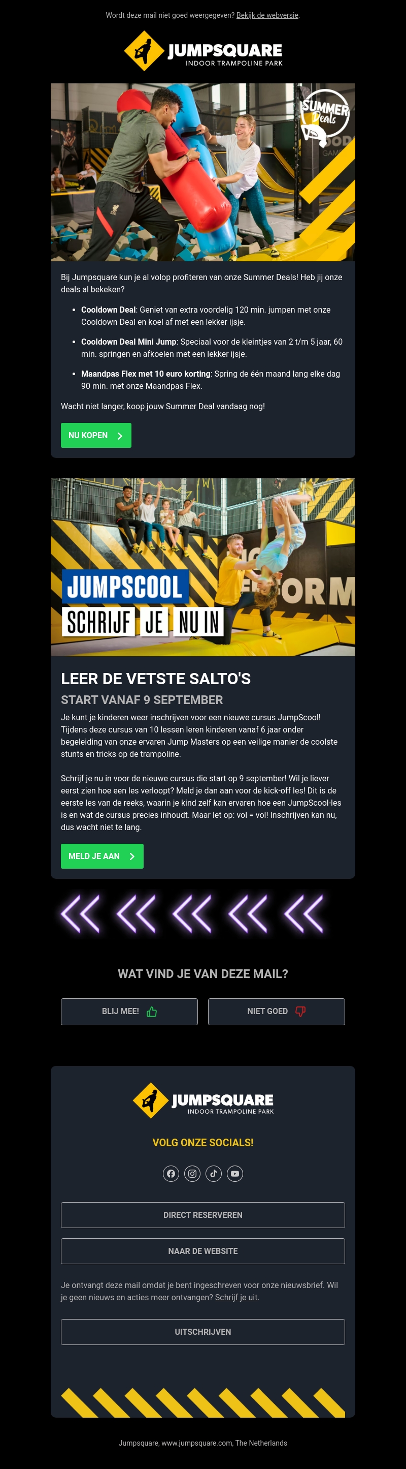Bij JumpSquare kun je nu profiteren van onze Summer Deals! Kijk naar onze exclusieve Cooldown Deal en Cooldown Deal Mini Jump. Ook kun je je nu inschrijven voor de nieuwe JumpScool cursus die op 9 september start. Mis het niet en schrijf je snel in!