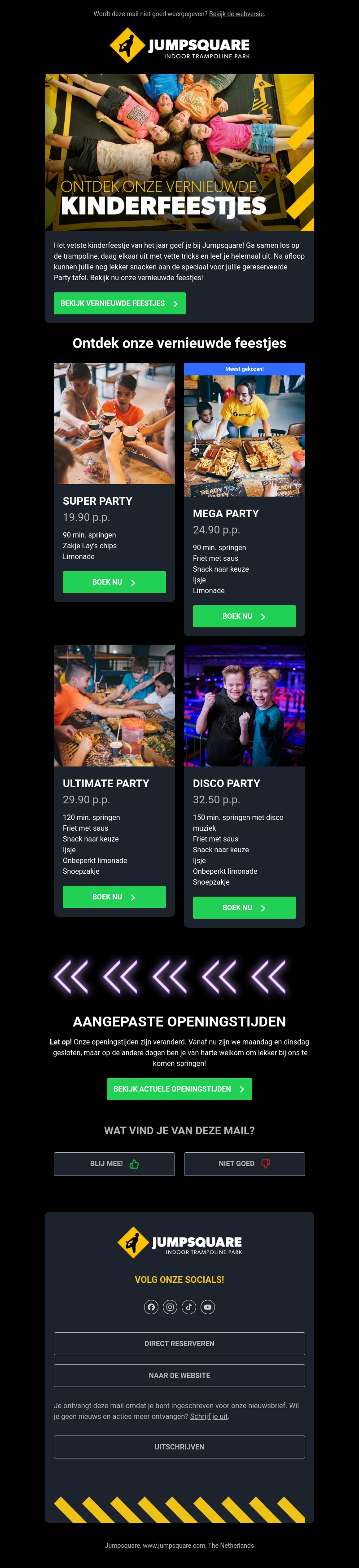 Plan het ultieme kinderfeestje bij Jumpsquare! Met vier unieke feestpakketten, waaronder de Super Party en Disco Party, is er voor elk wat wils. Geniet van trampolinespringen, snacks en meer. Ervaar een onvergetelijke dag vol vreugde en energie.