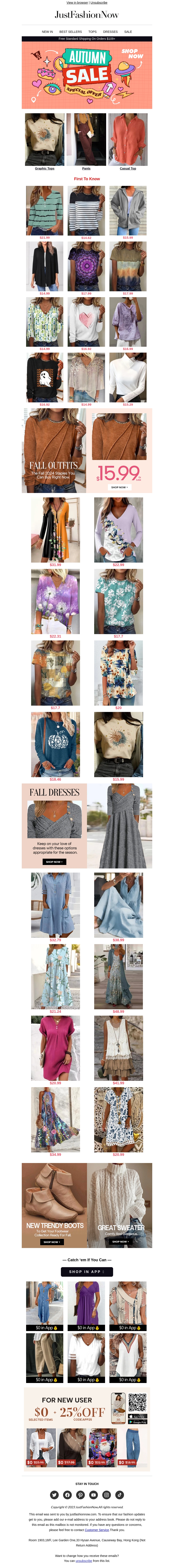 De herfst is aangebroken en dat betekent geweldige deals bij JustFashionNow! Verwen jezelf met trendy outfits, comfortabele truien en stijlvolle jurken voor slechts $15.99 of minder. Profiteer nu en vernieuw je garderobe voor het nieuwe seizoen.