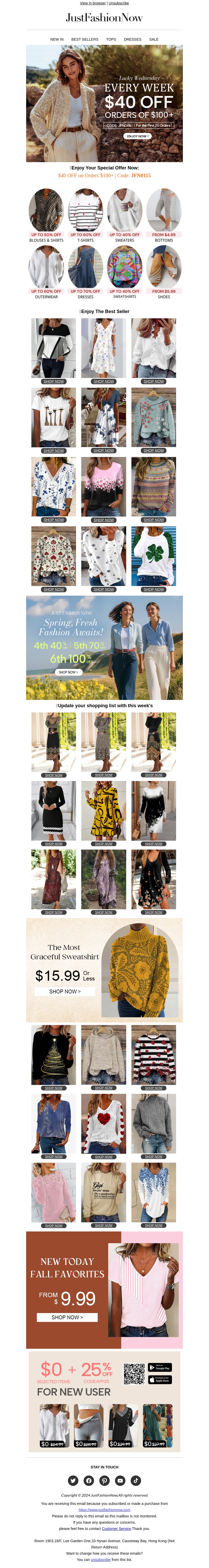 Deze nieuwsbrief brengt de beste modeaanbiedingen van JustFashionNow. Geniet van lentejurken vanaf slechts €9,99 en bespaar tot wel 90%! Elke week zijn er nieuwe aanbiedingen, waaronder $40 korting op bestellingen van meer dan $100. Mis de seizoensfavorieten niet en update je garderobe voordelig. Bekijk ook de nieuwe herfstfavorieten vanaf €9,99. Shop nu voordelig!