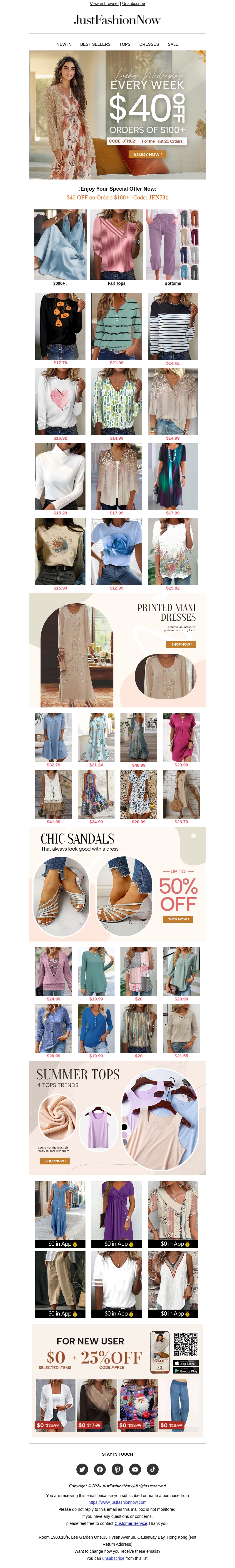 Krijg elke week $40 korting op bestellingen van $100+ met de couponcode JUNE731 bij JustFashionNow. Ontdek de nieuwste modetrends, van jurken tot zomer tops en sandalen. Mis deze geweldige aanbiedingen niet!