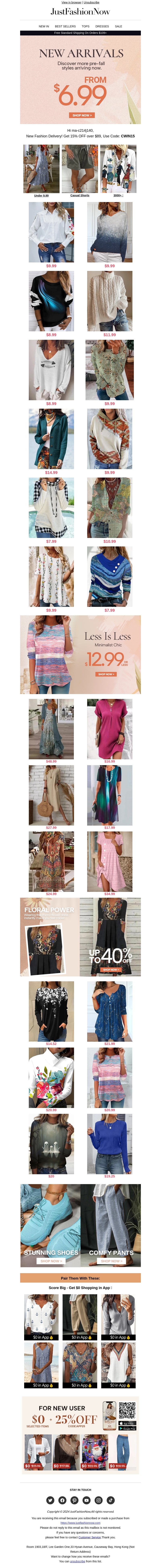 Ontdek de nieuwste pre-fall modetrends bij JustFashionNow met prijzen vanaf slechts $6,99. Geniet van geweldige kortingen op tops, jurken, broeken en meer. Gebruik de code CWW35 voor extra korting. Wees er snel bij en bespaar nu!