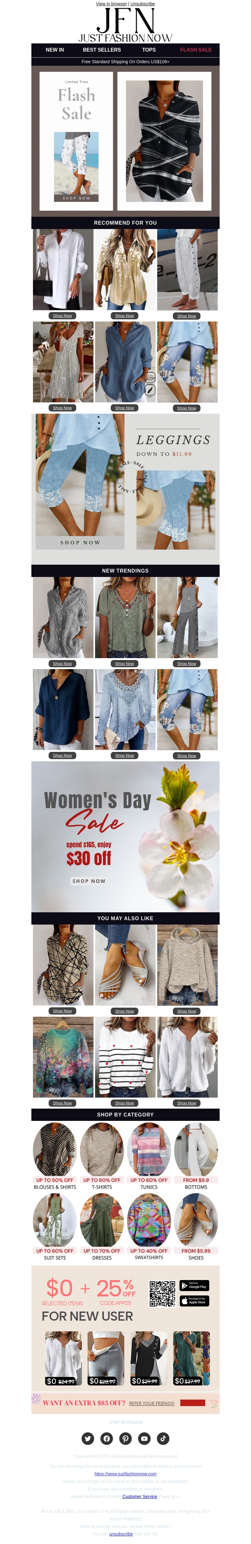 Mis de Flash Sale bij JFN niet! Verwen jezelf met trendy kleding voor scherpe prijzen. Leggings zijn nu verkrijgbaar vanaf slechts $11,99. Women's Day Sale nu met $30 korting bij besteding van $165. Voor nieuwe gebruikers is er een extra korting van 25% beschikbaar. Shop nu je nieuwe favoriete outfits en profiteer van deze geweldige deals!