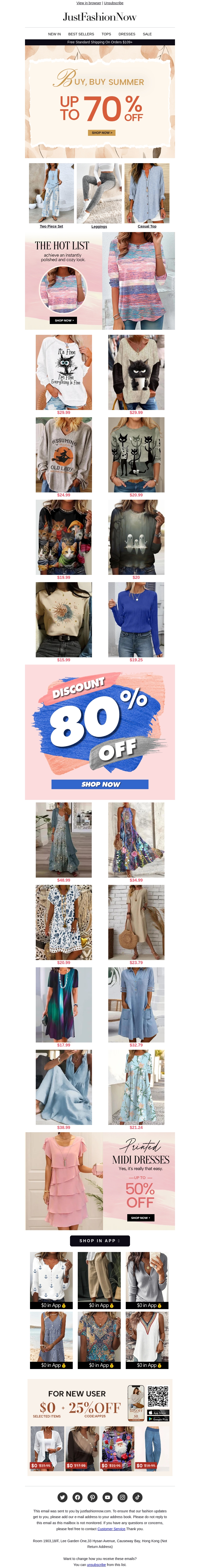 JustFashionNow biedt een geweldige zomeruitverkoop met kortingen tot wel 70%. Ontdek een breed assortiment aan trendy kledingstukken zoals tops, jurken, blouses en meer. Mis deze kans niet om je garderobe aan te vullen met stijlvolle stukken tegen ongelooflijke prijzen.