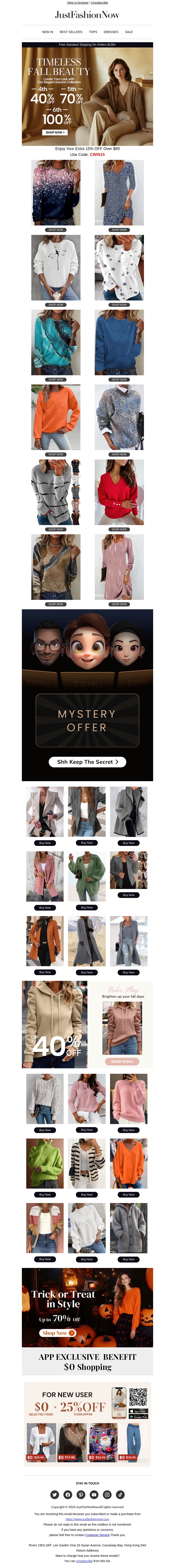 Beleef een stijlvolle herfst met de nieuwste collectie van JustFashionNow. Geniet van kortingen tot 70% op een breed scala aan kledingstukken, waaronder truien, jassen en jurken. Dit is de perfecte gelegenheid om je garderobe te vernieuwen met tijdloze stukken. Mis de Mystery Offer niet voor nog meer verrassingen. Of je nu thuis blijft of op pad gaat, zorg ervoor dat je er stijlvol uitziet. Shop nu en maak gebruik van exclusieve aanbiedingen!