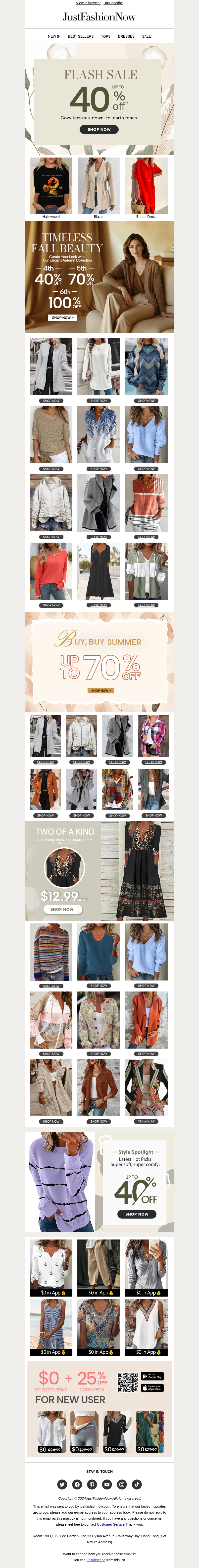 Ontdek de geweldige Flash Sale met kortingen tot 40% bij JustFashionNow. Van tijdloze herfstmode tot trendy zomerkleding, er is voor ieder wat wils. Mis het niet om je garderobe te vernieuwen met stijlvolle en betaalbare kleding. Veel items zijn snel uitverkocht, dus wees er snel bij.