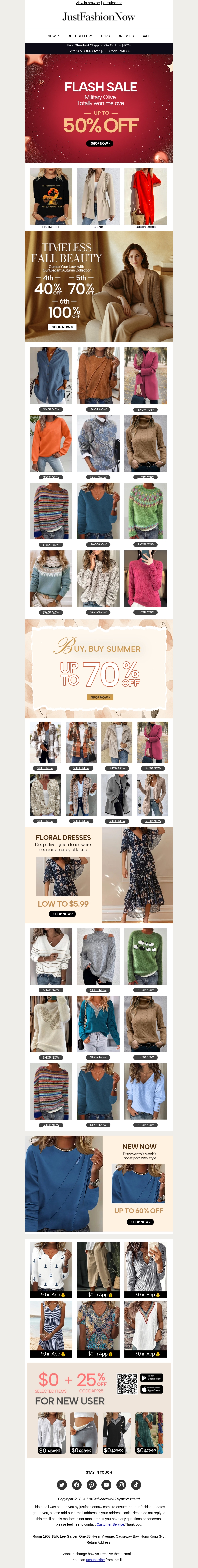 Profiteer nu van de geweldige flash sale bij JustFashionNow! Ontvang tot 50% korting op een breed scala aan stijlvolle kleding. Van herfstmode tot zomerkleding en bloemdessins, deze deals wil je niet missen!