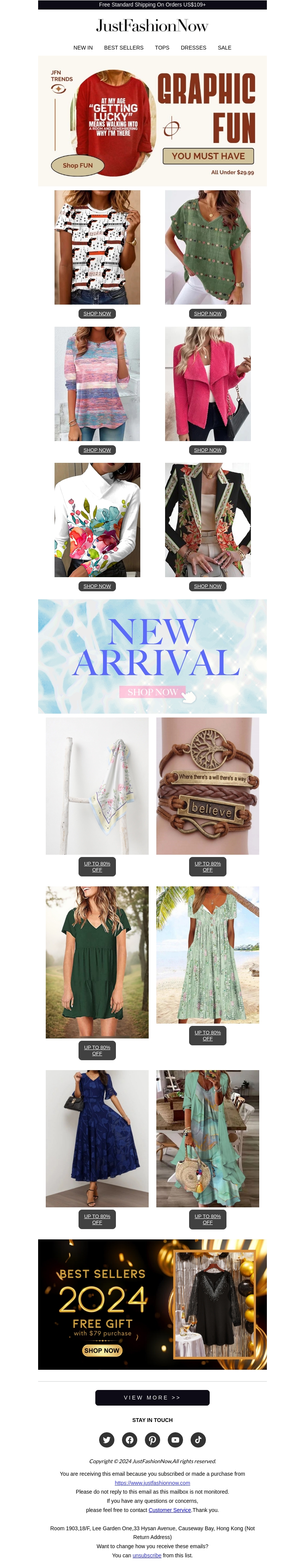 Ontdek unieke Graphic Fun designs bij JustFashionNow met maar liefst 70% korting op de eindsale. Van kleurrijke tops tot trendy jurken, er is voor elk wat wils. Haal de nieuwste stijlen binnen voordat ze op zijn. Gratis standaard verzending op bestellingen vanaf $109!