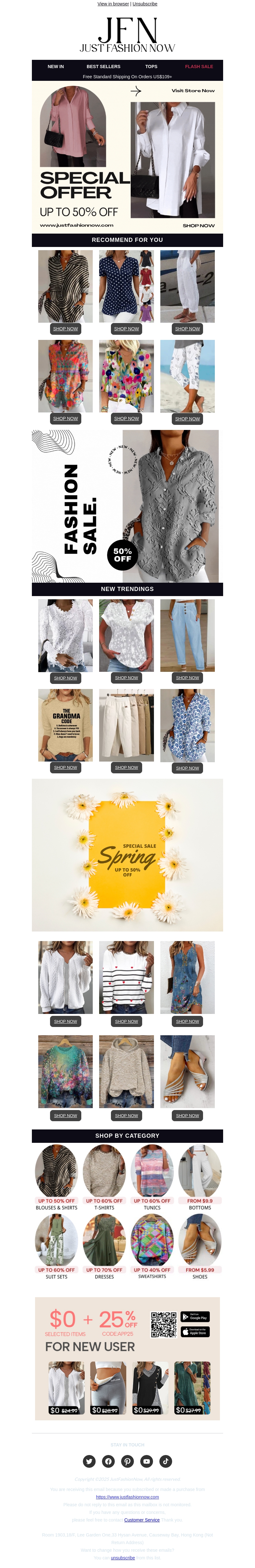 Welkom bij Just Fashion Now, waar uw perfecte look net is gearriveerd! Geniet van speciale kortingen tot 50% op een breed scala aan trendy kledingstukken. Of u nu op zoek bent naar elegante blouses of comfortabele schoenen, wij hebben iets voor u. Mis onze speciale lente-uitverkoop niet. Nieuwe gebruikers krijgen extra voordelen. Shop vandaag nog en ontdek de nieuwste trends!