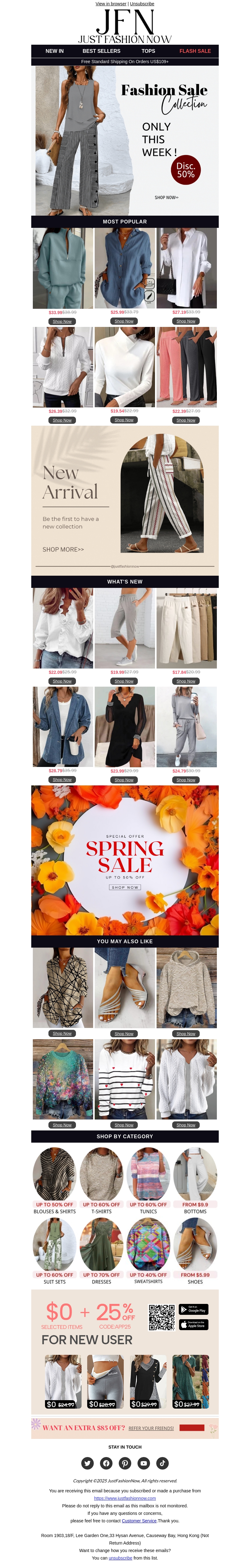 Duik in de nieuwste lentetrends met Just Fashion Now. Geniet deze week van maar liefst 50% korting op geselecteerde artikelen. Ontdek elegante en luchtige outfits uit onze nieuwe collectie. Wees de eerste om de must-have stijlen te bemachtigen. Vergeet niet de speciale kortingscode voor nieuwe gebruikers te gebruiken. Bezoek ons snel om niets te missen!