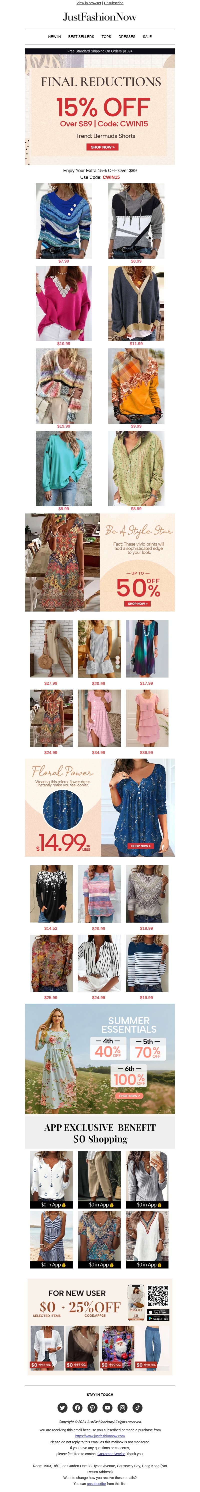Duik in de laatste mode met fantastische kortingen. Ontvang 15% korting op bestellingen boven $89 bij JustFashionNow. Deels Bermuda shorts en nog veel meer trendy items zijn nu extra voordelig. Koop nu om je garderobe te vernieuwen.