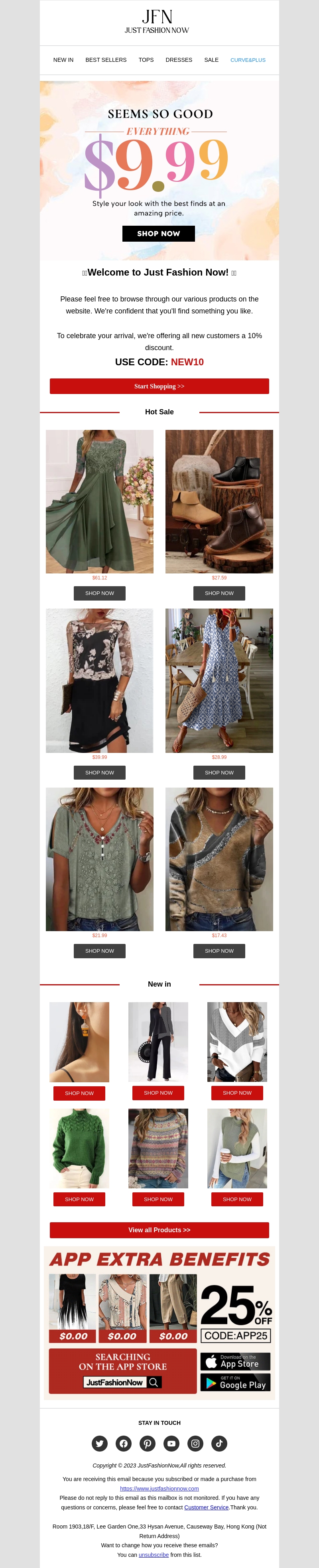 Welkom bij Just Fashion Now! Verken diverse producten en vind iets wat bij je past. Nieuwe klanten krijgen 10% korting op hun eerste aankoop. Gebruik code NEW10 bij het afrekenen. Bekijk onze hete uitverkoop en nieuwste items nu!