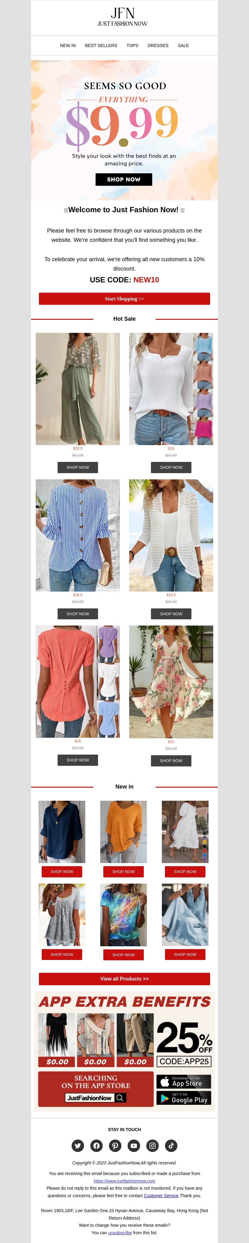 Welkom bij Just Fashion Now! Maak kennis met ons ruime aanbod aan modieuze kleding. Als nieuwe klant krijgt u nu 10% korting op uw eerste aankoop. Ontdek onze nieuwste collecties en bestsellers. Profiteer snel van deze geweldige aanbieding!