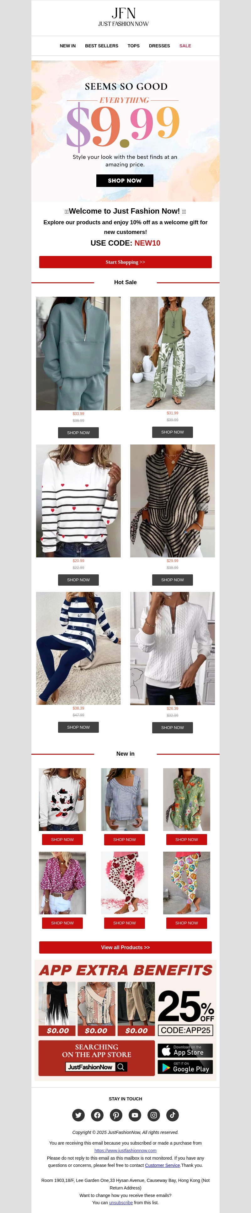 Welkom bij Just Fashion Now! Geniet van een speciale 10% korting voor nieuwe klanten. Ontdek onze stijlvolle kledingcollectie met items vanaf slechts $9.99. Blader door onze nieuwste aankomsten en vind fantastische deals op hot sale artikelen. Mis deze kans niet om uw garderobe te vernieuwen.