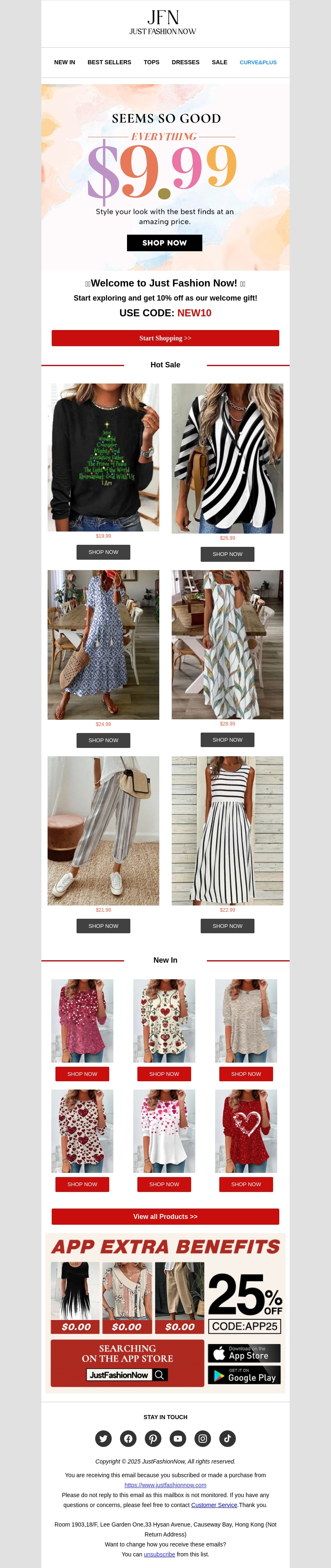 Welkom bij Just Fashion Now! Geniet van 10% korting als ons welkomstgeschenk. Ontdek modieuze items voor slechts $9,99. Mis onze hete aanbiedingen niet! Gebruik code NEW10 voor uw korting en ontdek onze nieuwe collecties en exclusieve app-voordelen. Begin nu met winkelen!