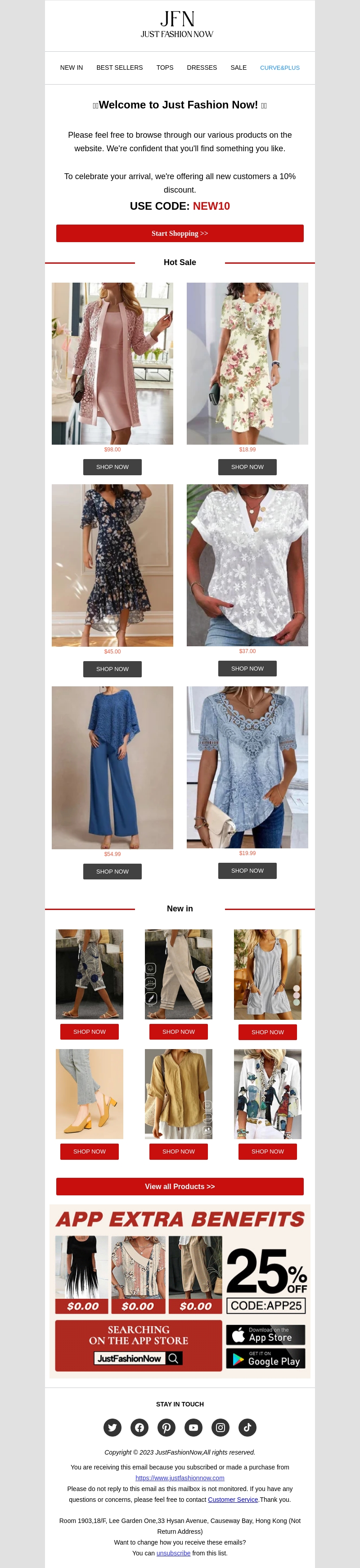 Welkom bij Just Fashion Now! Als nieuwe klant krijg je 10% korting op je eerste aankoop met de code NEW10. Ontdek onze nieuwste collectie en geniet van extra voordelen bij winkelen via onze app.