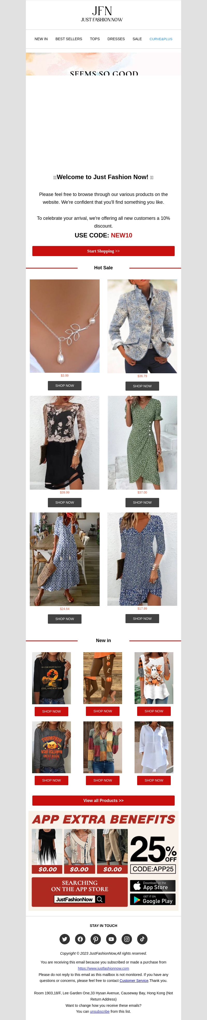 Welkom bij Just Fashion Now! Als nieuwe klant krijgt u 10% korting op uw eerste aankoop. Blader door onze collecties van topjes, jurken, en meer. Mis de hete aanbiedingen en nieuwe items niet. Veel winkelplezier!