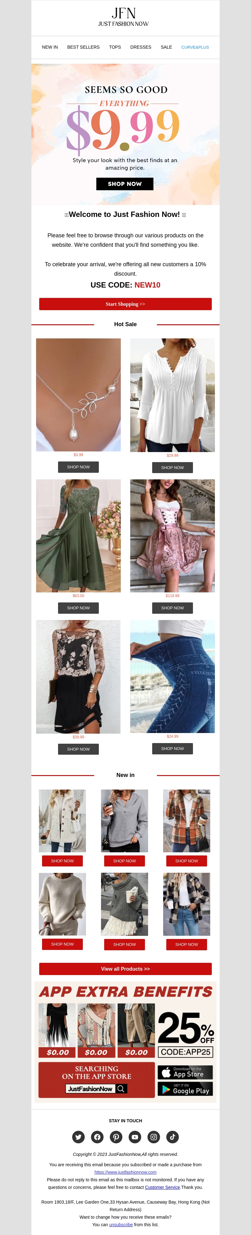 Welkom bij Just Fashion Now! Wij bieden nieuwe klanten een speciale korting van 10% op hun eerste aankoop. Verken onze collecties en vind de perfecte outfit voor elke gelegenheid. Gebruik de code NEW10 om van deze aanbieding te profiteren.