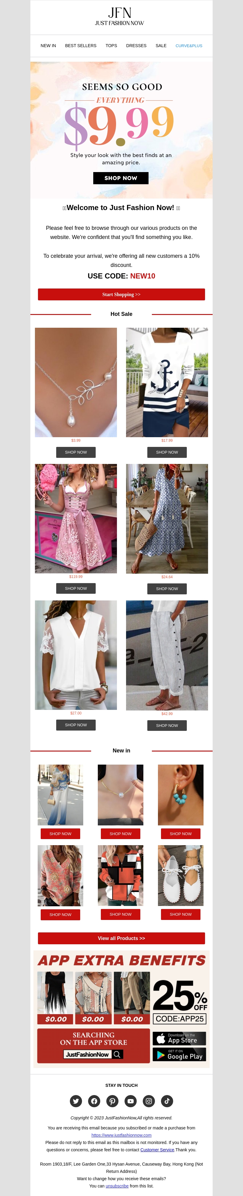 Welkom bij Just Fashion Now! Verken onze nieuwste collectie aan trendy kleding en accessoires. Geniet van een speciale 10% korting voor nieuwe klanten met de code NEW10. Ontdek geweldige aanbiedingen zoals alles voor $9.99 en nog veel meer. Shop nu de best verkochte stijlen, nieuwe binnenkomers en hot sales. Download onze app voor extra voordelen.