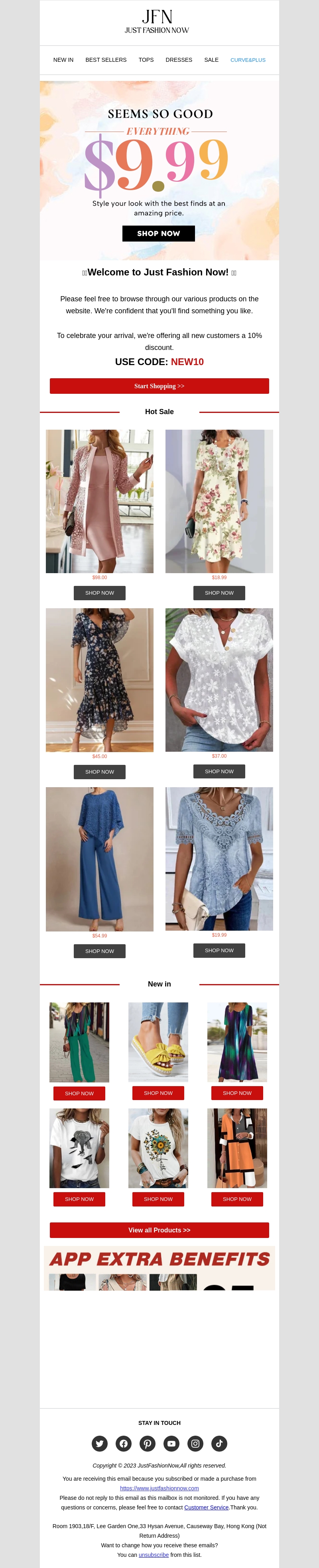 Welkom bij Just Fashion Now! Verken onze nieuwste collectie mode met kortingen vanaf $9,99. Nieuwe klanten krijgen 10% korting op hun eerste aankoop met de code NEW10. Shop nu en ontdek je nieuwe favoriete stijlen!