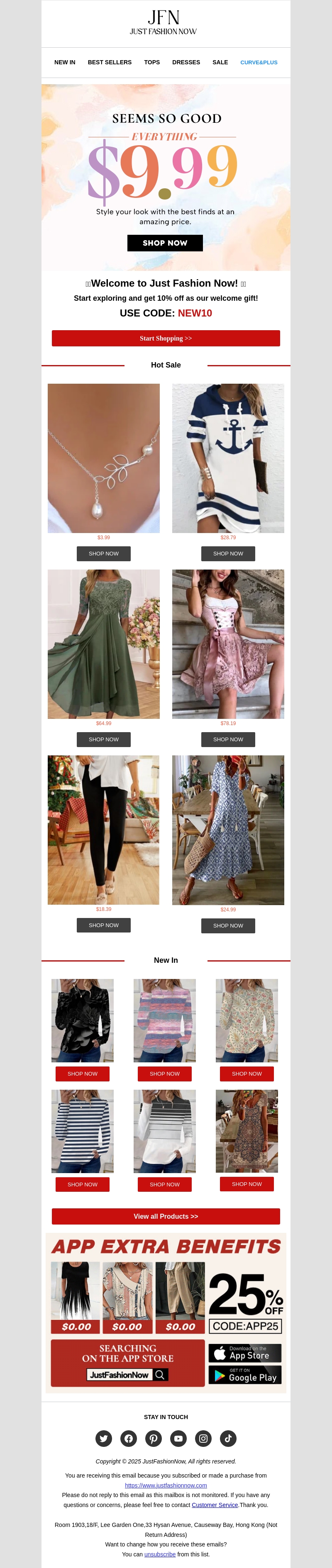Welkom bij Just Fashion Now! Start je winkelen met een welkomstcadeau van 10% korting. Gebruik de code NEW10 bij je eerste bestelling. Ontdek de nieuwste modetrends en geniet van items voor slechts $9,99. Bekijk de beste deals in onze Hot Sale sectie. Mis ook de extra voordelen in onze app niet.