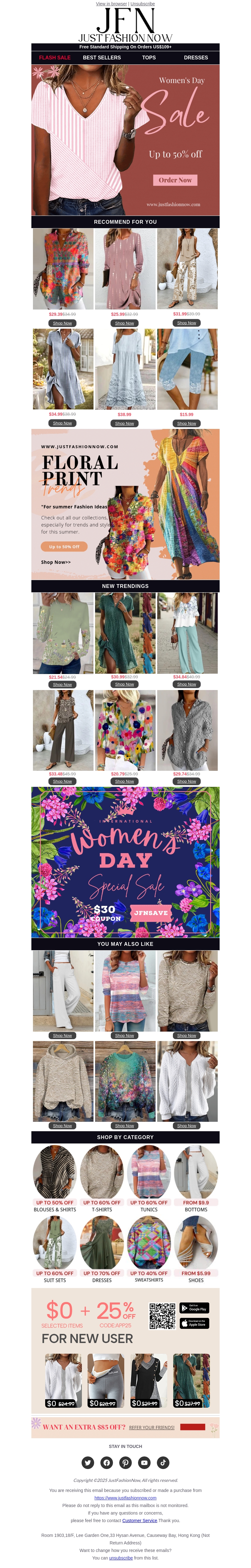 Dit speciale Women's Day nieuwsbericht van Just Fashion Now biedt stijlvolle kledingaanbiedingen. Profiteer van kortingen tot 50% op topmerken en ontdek trendy zomerideeën met bloemmotieven. Wees niet te laat en bestel vandaag nog!