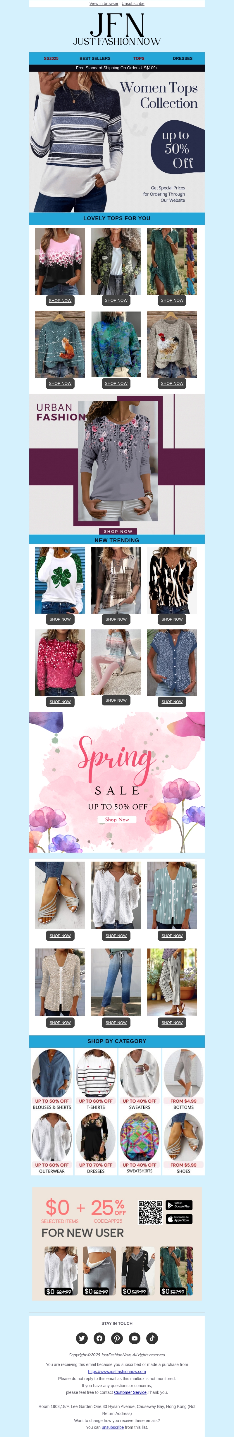 De nieuwste lente stijlen zijn gearriveerd bij Just Fashion Now. Ontdek trendy tops, jurken en meer met kortingen tot wel 50%. Profiteer van speciale aanbiedingen voor nieuwe gebruikers en gratis verzending bij grote bestellingen. Mis het niet!