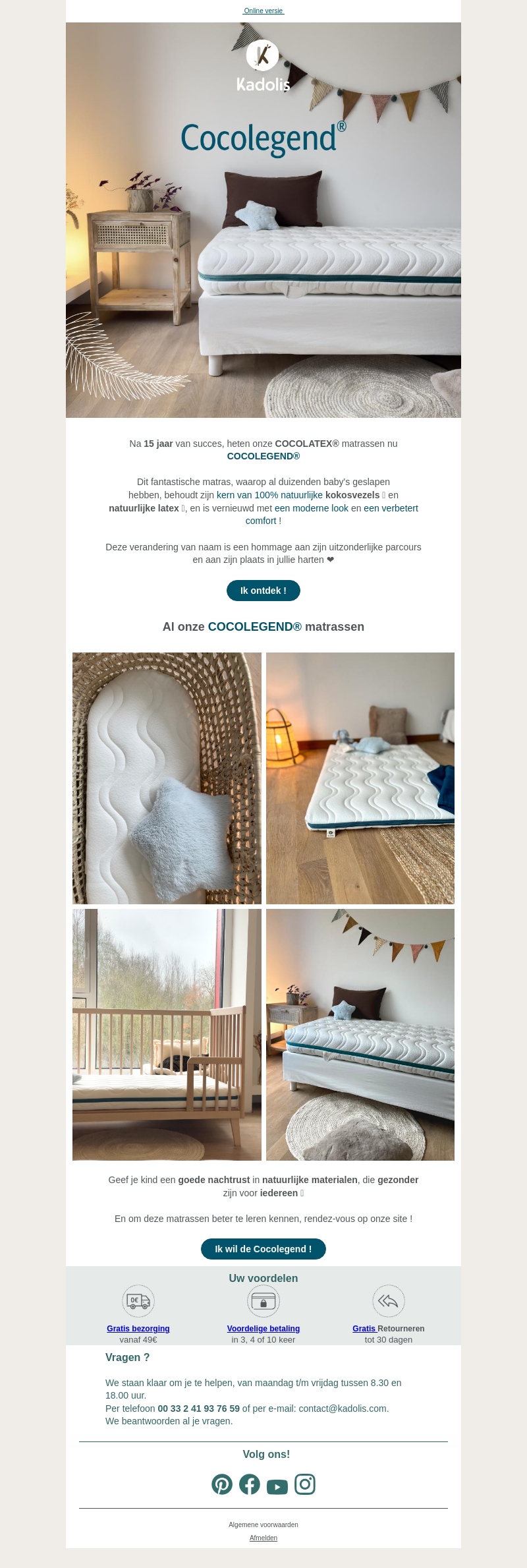 Na 15 jaar veranderen de COCOLATEX® matrassen van naam naar COCOLEGEND®. Deze unieke matrassen zijn gemaakt van 100% natuurlijke kokosvezels en latex en bieden voortreffelijk comfort. Ze zijn ontworpen voor iedereen die waarde hecht aan een gezonde en goede nachtrust. Duizenden baby's hebben hierop al geslapen. Ontdek ze vandaag nog!