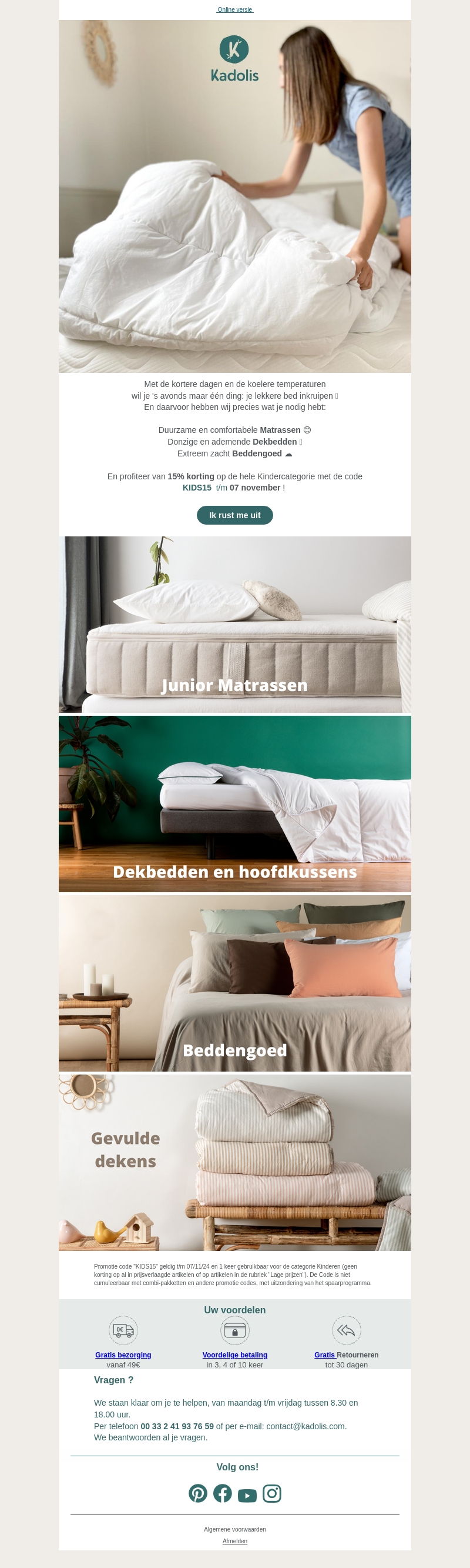 Geniet van warme en comfortabele nachten met Kadolis beddengoed. We bieden een selectie van duurzame matrassen, ademende dekbedden en zijdezacht beddengoed. Profiteer nu van 15% korting op de hele kindercategorie. Gebruik de kortingscode KIDS15 voor 7 november voor extra besparingen. Maak je slaapkamer gezellig en knus met onze kwaliteitsproducten.