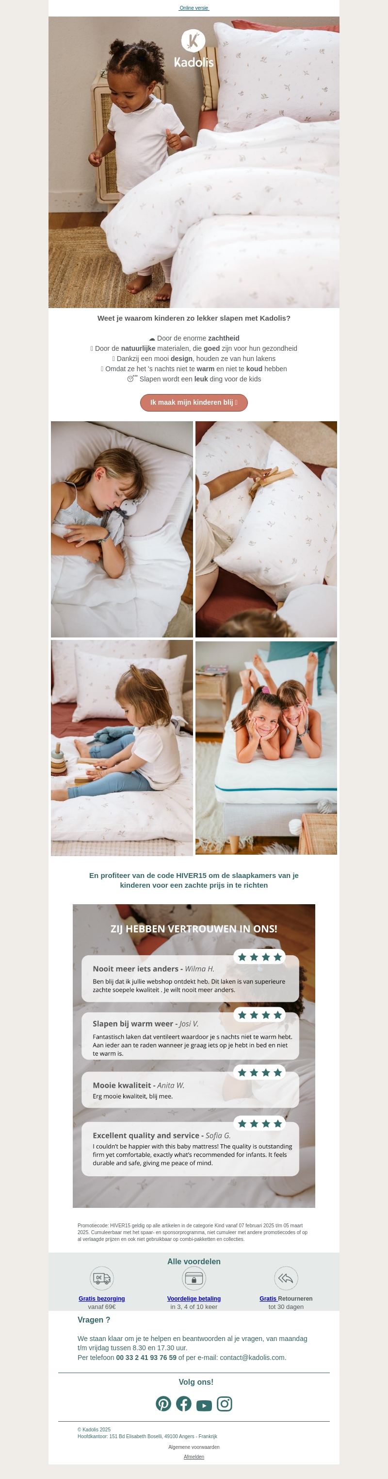Kadolis biedt beddengoed van natuurlijke materialen die zorgen voor een goede nachtrust voor je kinderen. Ervaar de zachtheid en kwaliteit die bijdraagt aan een gezond slaapklimaat. Gebruik de code HIVER15 voor een speciale korting en maak van slapen een plezier voor de kids.