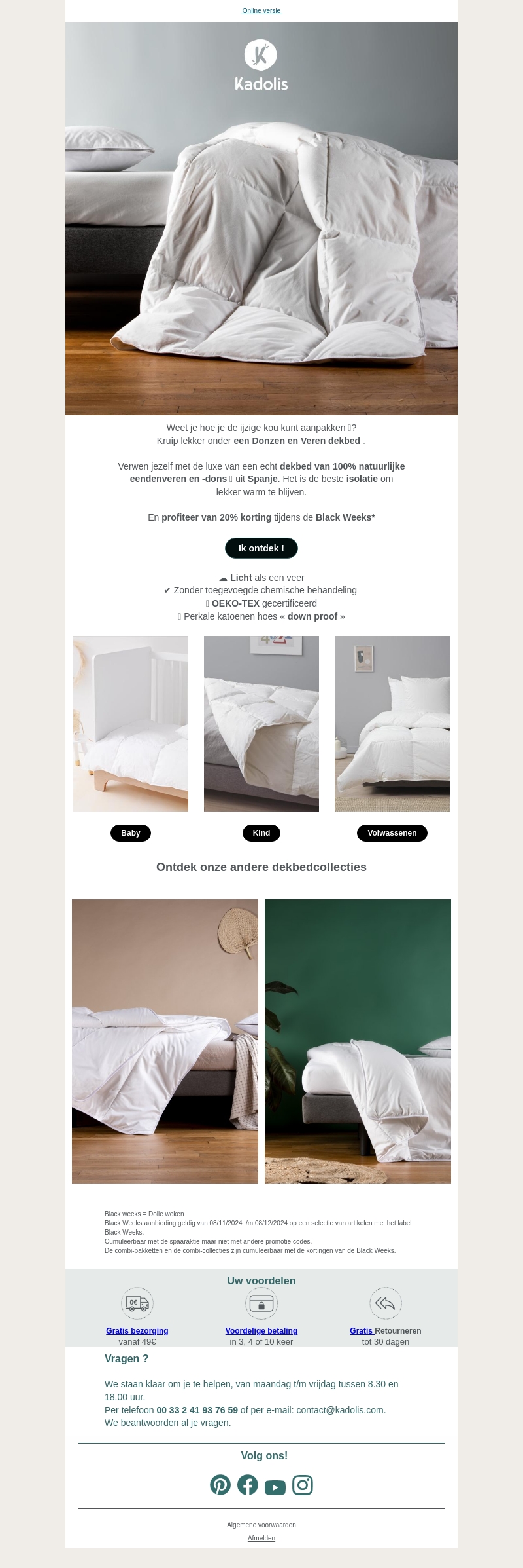 Ervaar de beste isolatie tegen de kou met Kadolis' natuurlijke eendendons dekbedden uit Spanje. Geniet van een korting van 20% tijdens de Black Weeks. Zonder chemische behandeling en OEKO-TEX gecertificeerd, biedt Kadolis comfort voor babyβs, kinderen en volwassenen.