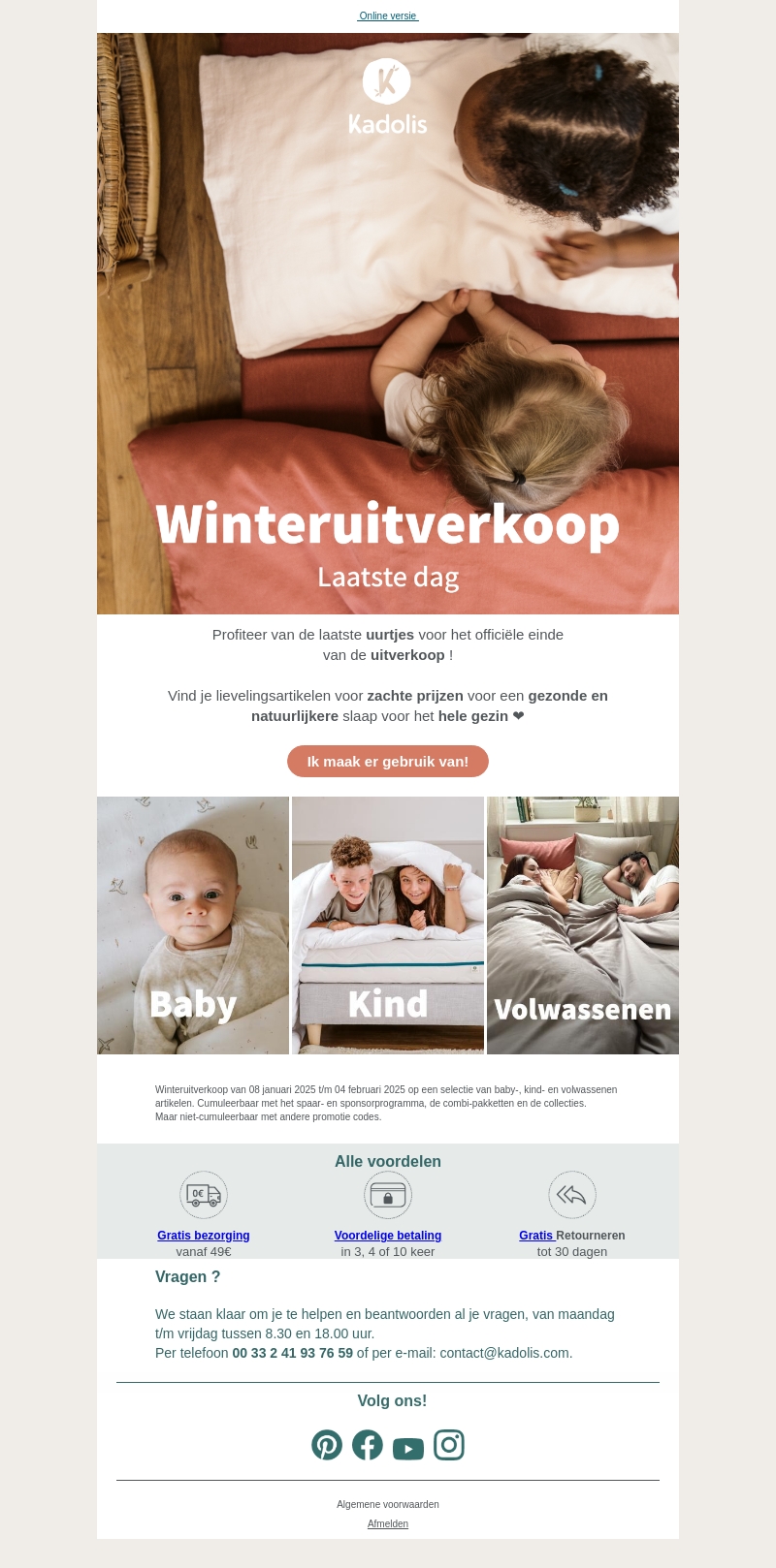 Profiteer van de laatste uren van de Kadolis winteruitverkoop. Ontdek geweldige deals op baby-, kinder- en volwassenartikelen. Grijp de kans om je favoriete producten voor zachte prijzen te bemachtigen. Zorg voor een gezondere en natuurlijkere slaap voor het hele gezin. Geniet van gratis verzending vanaf €49 en flexibele betalingsopties.