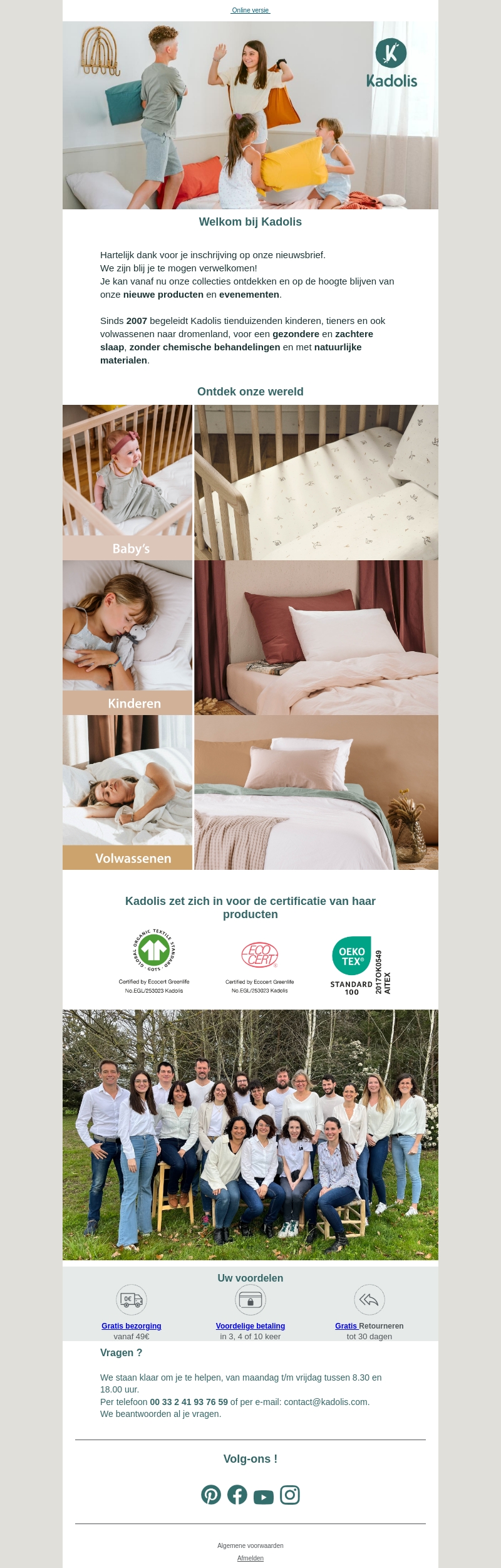 Bedankt voor je inschrijving bij Kadolis! Ontdek onze nieuwste collecties en blijf op de hoogte van producten en evenementen. Sinds 2007 biedt Kadolis gezonde, zachte slaapproducten zonder chemische toevoegingen, gemaakt van natuurlijke materialen. Bekijk ons aanbod voor baby's, kinderen en volwassenen. Wij zetten ons in voor gecertificeerde producten voor jouw veiligheid.
